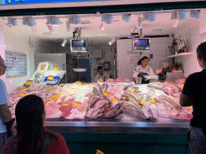 Ein weiteres beinahe tägliches Highlight ist der Besuch der Markthalle. Hier gibt es etliche Stände mit Obst, Gemüse, Fisch und Fleisch. Insbesondere das Angebot an Fisch und sonstigen Meeresfrüchten ist spektakulär und der Fisch ist fangfrisch vom frühen Morgen. So lange wir hier sind habe ich daher das Kochen übernommen und es gibt tägliches Frisches vom Markt.